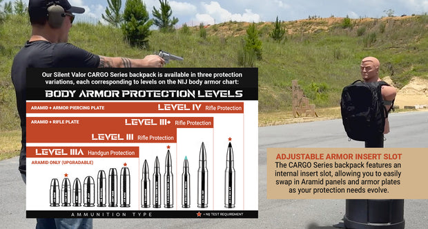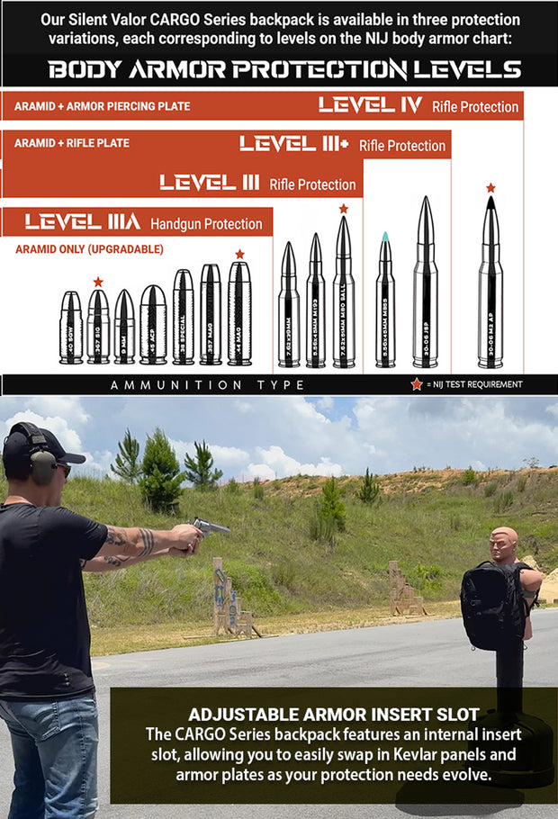 Built for mobility, engineered for security, and designed to scale from everyday carry to rifle-rated defense. The Silent Valor CARGO Series is a modular defense system disguised as a civilian travel pack. Whether you need a rugged tactical backpack with no armor, or full ballistic capability up to Level IV — the platform adapts to your environment, mission, and threat level.