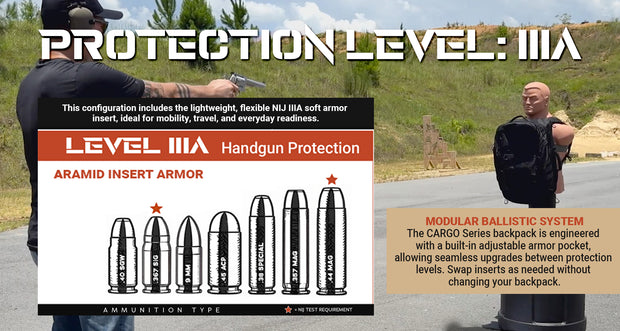 Real testing. Real results. This configuration includes the Level IIIA soft armor insert—proven against common handgun threats and validated through live-fire demonstrations, not lab theory.