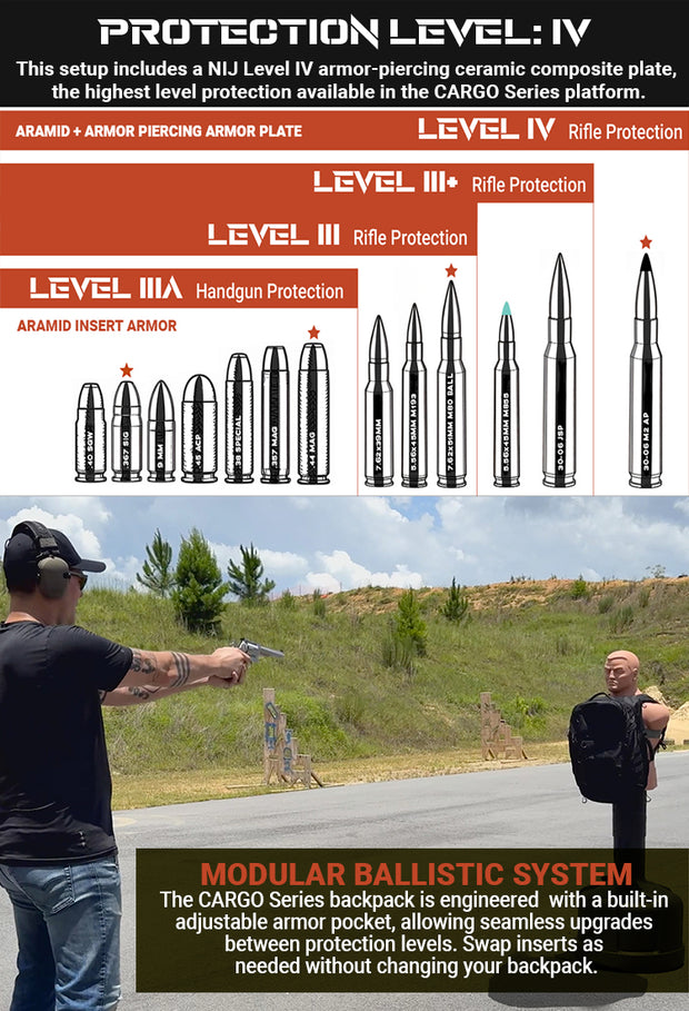 When the mission demands the highest level of personal ballistic defense, the CARGO IV configuration delivers uncompromising capability. This setup includes the removable Level IIIA soft armor panel for everyday handgun threat protection, paired with a full Level IV armor-piercing rifle plate engineered to stop advanced rifle threats including .30-06 M2 AP.