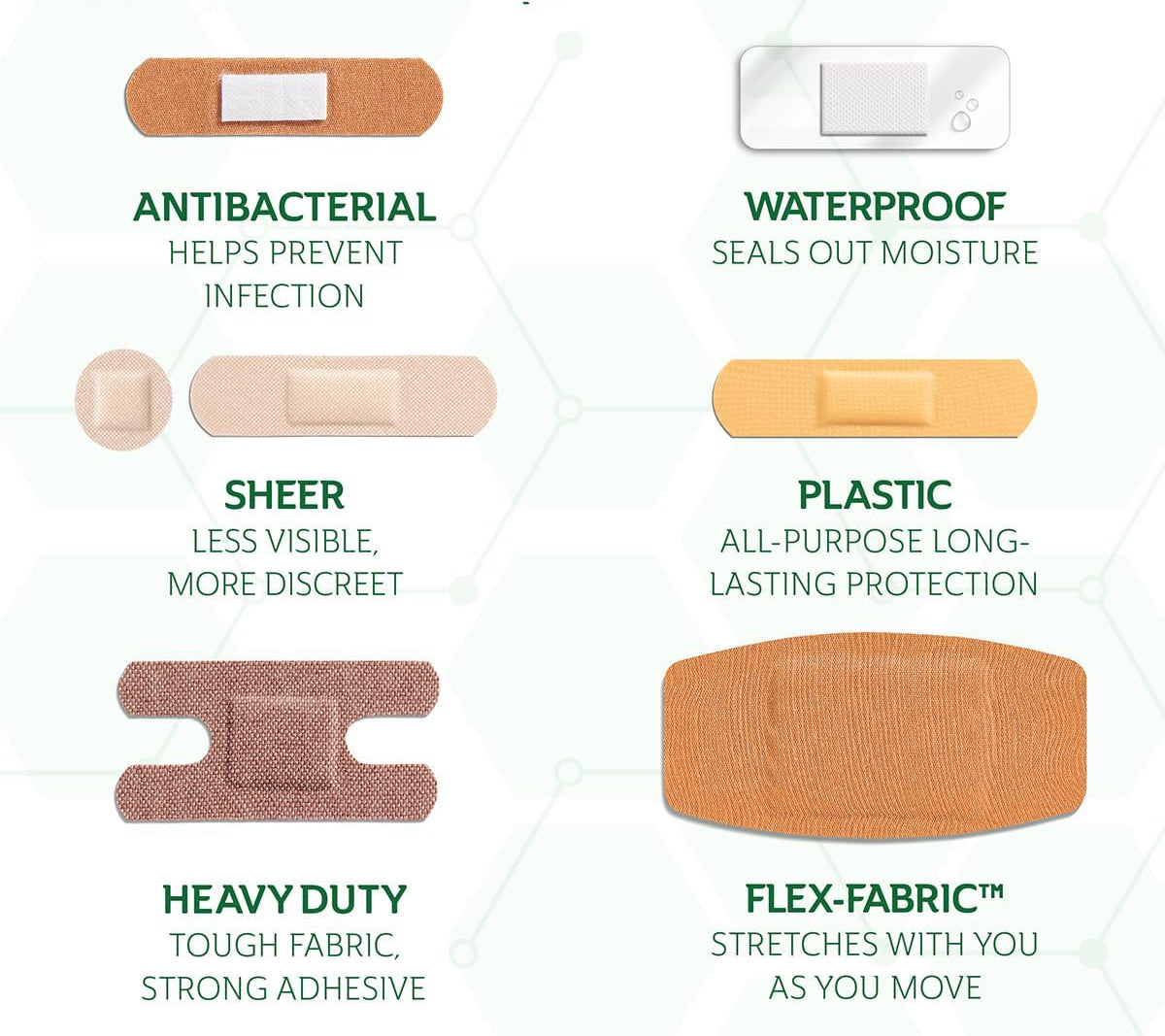 - Variety of bandage styles for cuts, scrapes, and minor burns